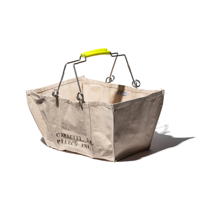 Canvas material market basket with steel handles.