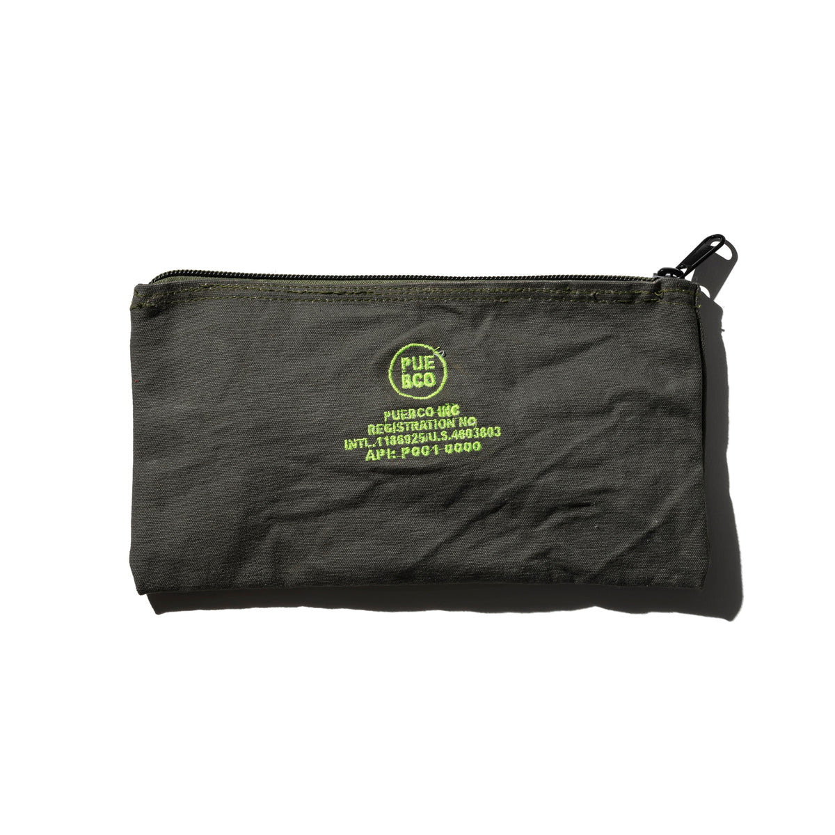 Adding a striking modern contrast to it's earthy green, timeworn fabric, the pouch features vibrant neon embroidery that punctuates its rugged aesthetic with a bold pop of color.  Sturdy zip closure ensures your essentials are securely stored, making it a versatile and durable choice for organizing accessories, travel necessities, or everyday items.