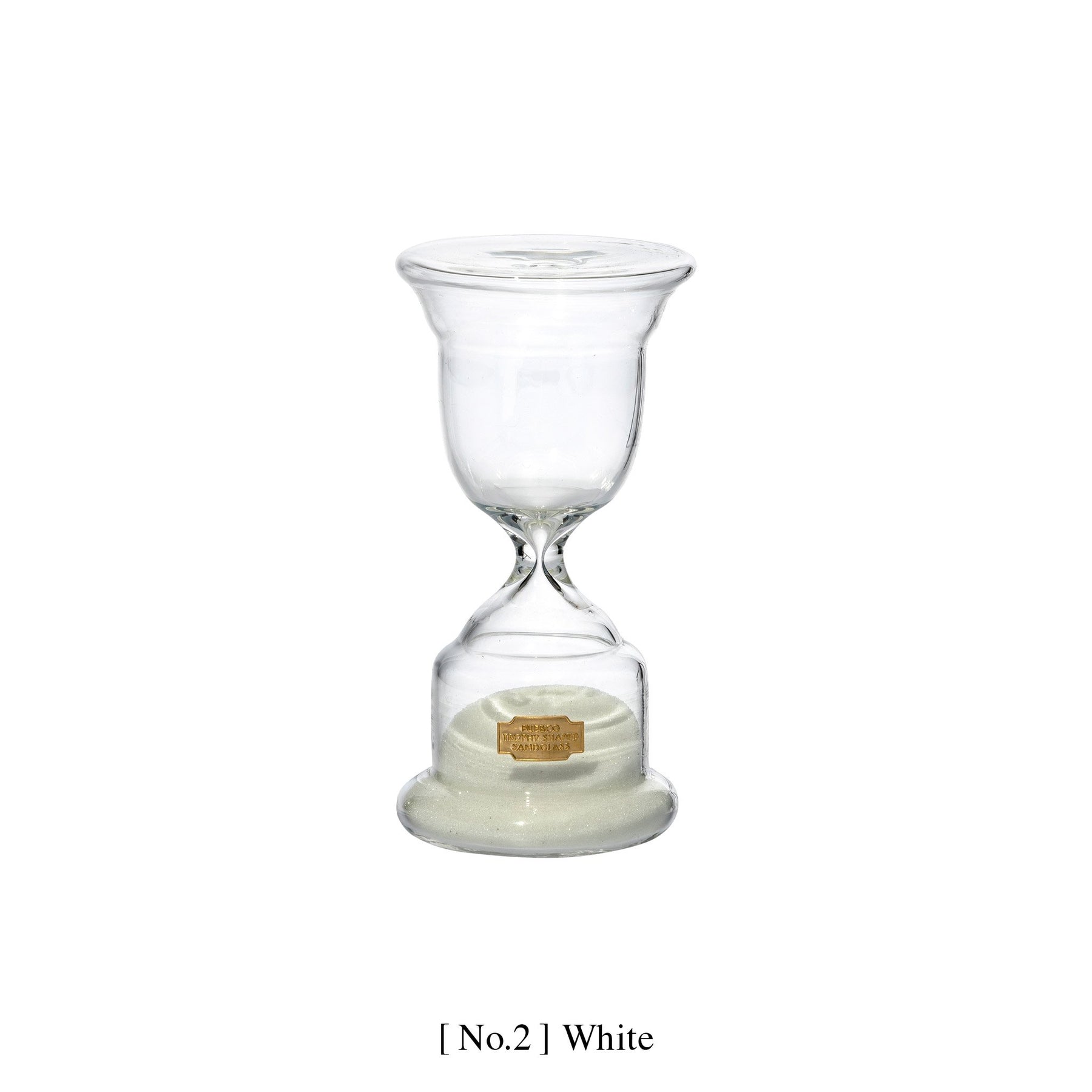A playful take on the hourglass, these come in the shape of "trophies" and are made from a full glass body for a refined look. Choose the size/shape and black or white sand.